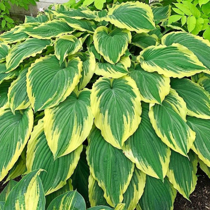 Here we see a lush, dense grouping of Hostas with dramatically variegated leaves that boast a deep, rich green center surrounded by wide, irregular bands of bright, sunny yellow. The substantial, ribbed leaves overlap beautifully, creating a tropical and robust texture right on the ground plane.