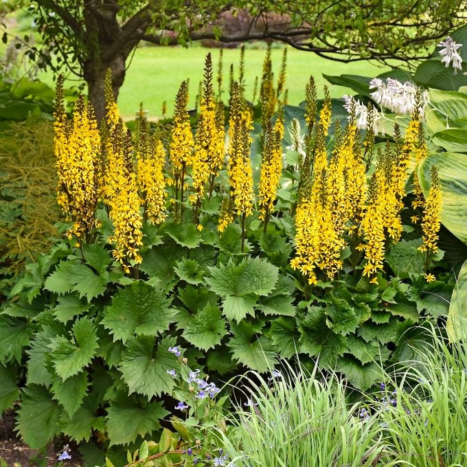A beautiful display of tall, slender spikes covered in small, cheerful yellow flowers rises dramatically above a base of large, jagged, deep green foliage in this image. This plant is Ligularia, and it adds incredible vertical interest to the planting scheme.