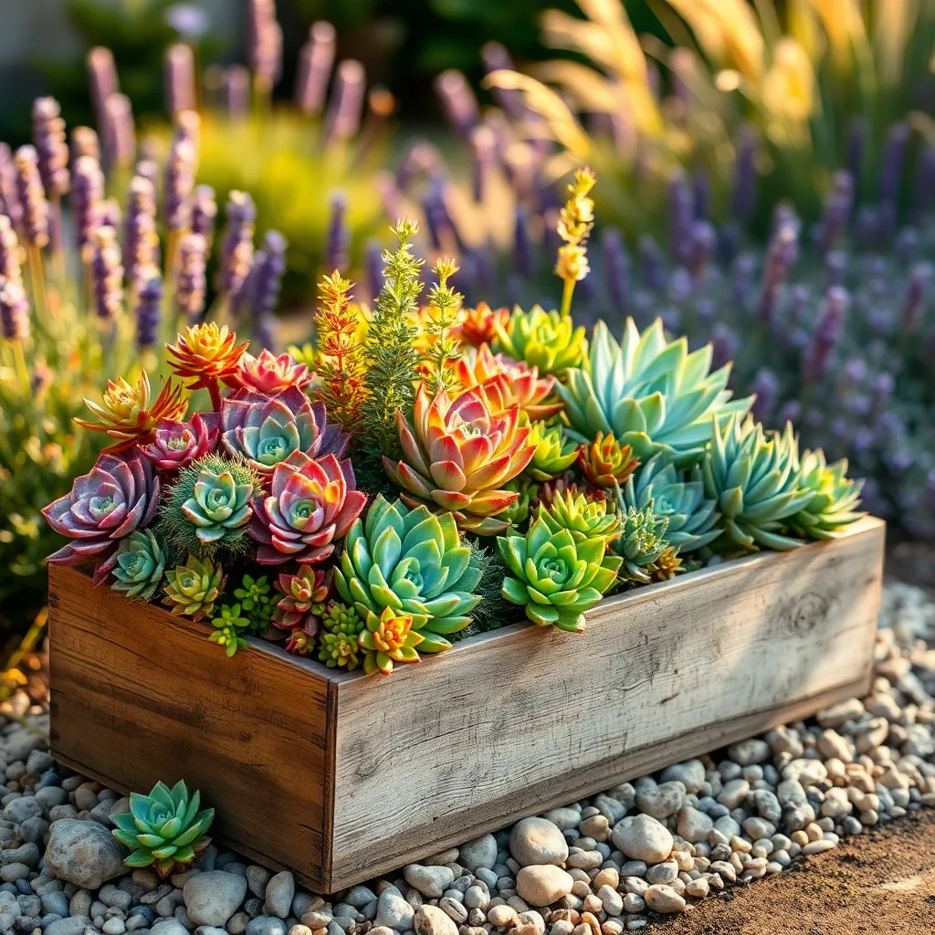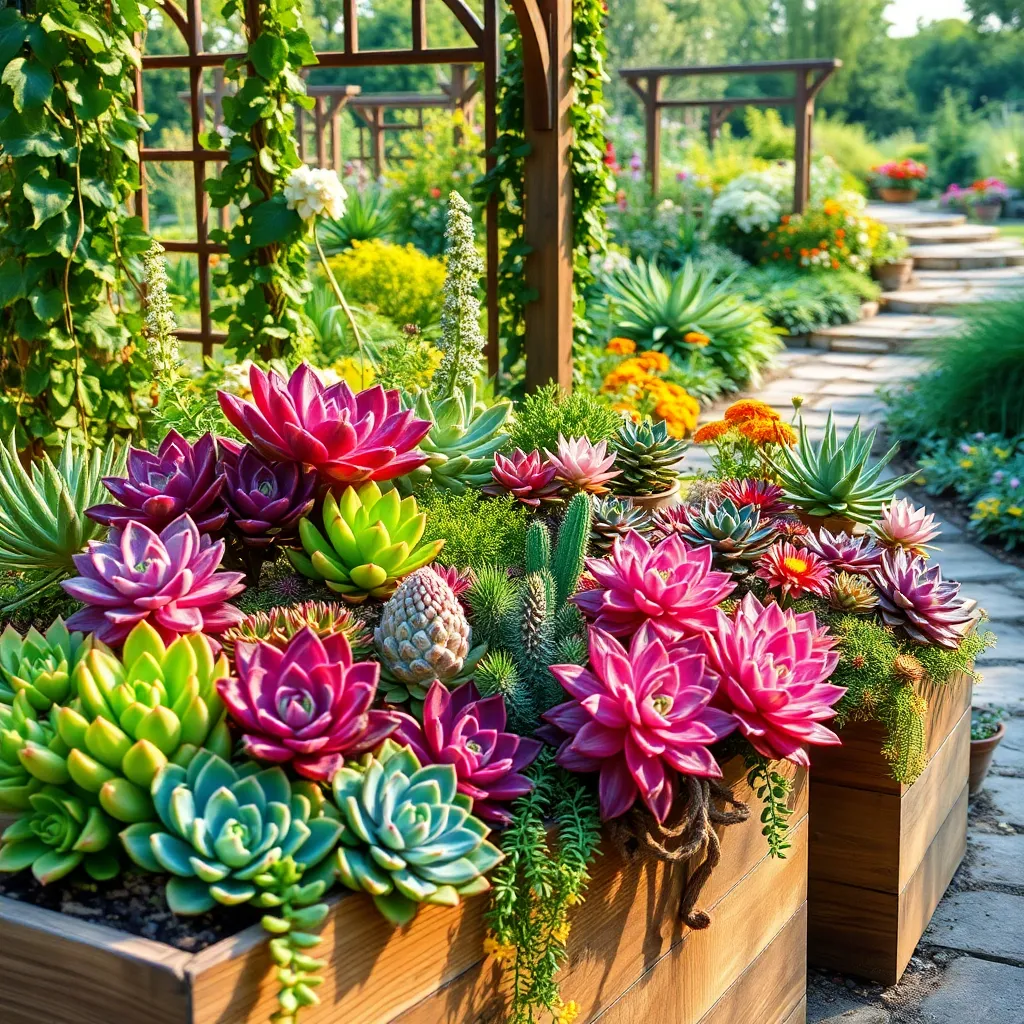 The scene feels lush, abundant, and intensely colorful, capturing the magic of a midsummer garden basking in bright light. It’s a statement piece that blends the structure of woodworking with the wild beauty of the plants. For a similar effect, use a cedar or redwood raised bed and choose varieties like Echeveria ‘Afterglow’ or ‘Neon Breakers’ to achieve those show-stopping bright pinks and magentas.