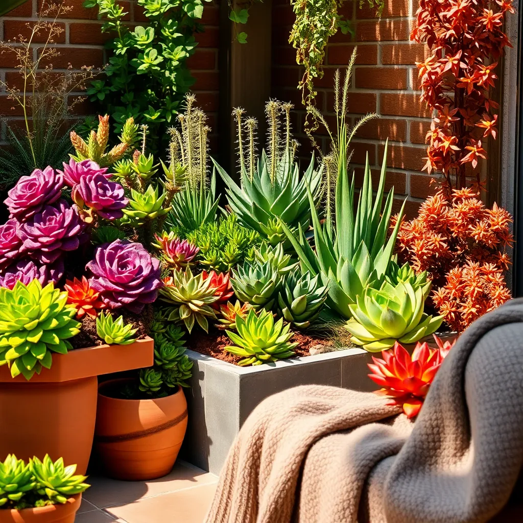 The mood is luxurious, bold, and incredibly private, like a small, sun-drenched retreat where you can wrap up in a blanket and enjoy the vibrant colors. The deep tones of the plants and the terracotta create a sense of Old World richness. To achieve this level of color intensity, combine species that show high-contrast colors, such as a large magenta Echeveria next to a spiky, lime-green Aloe or Agave.