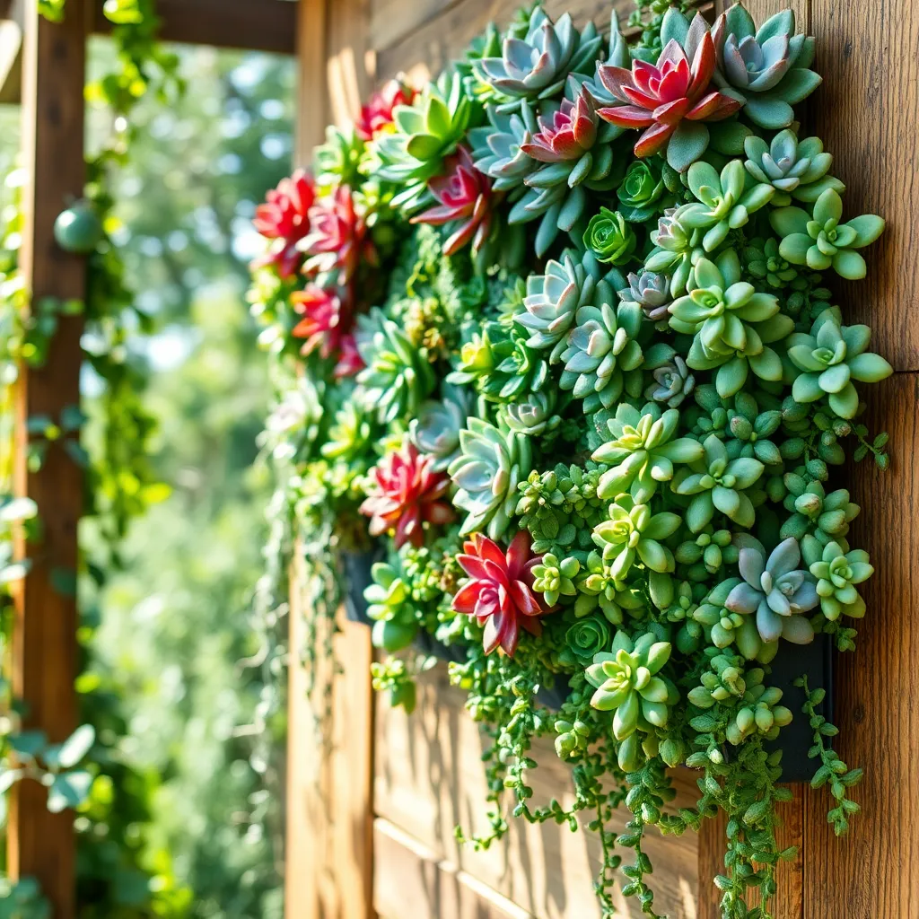 This picture showcases a beautiful vertical garden mounted directly onto a warm wooden exterior wall, turning a plain surface into a living art installation. The design features a mix of tight rosettes and trailing varieties, creating a lush, textured rectangular frame with striking accents of red and deep emerald green. The vertical orientation is highly impactful because it saves space and brings the plants up to eye level, allowing the texture and color variations to be easily appreciated.