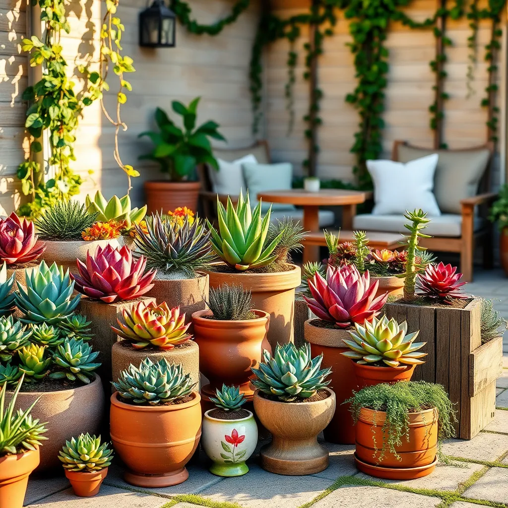 This dynamic arrangement features a tiered display of numerous succulents in a variety of terracotta pots, some plain and some patterned, creating a full and textural screen on a patio. The plants range from tall, spiky Agaves to low, colorful rosettes, all carefully positioned to create a layered and interesting visual stack. The layering of different pot sizes and shapes adds significant depth and prevents the arrangement from looking flat.