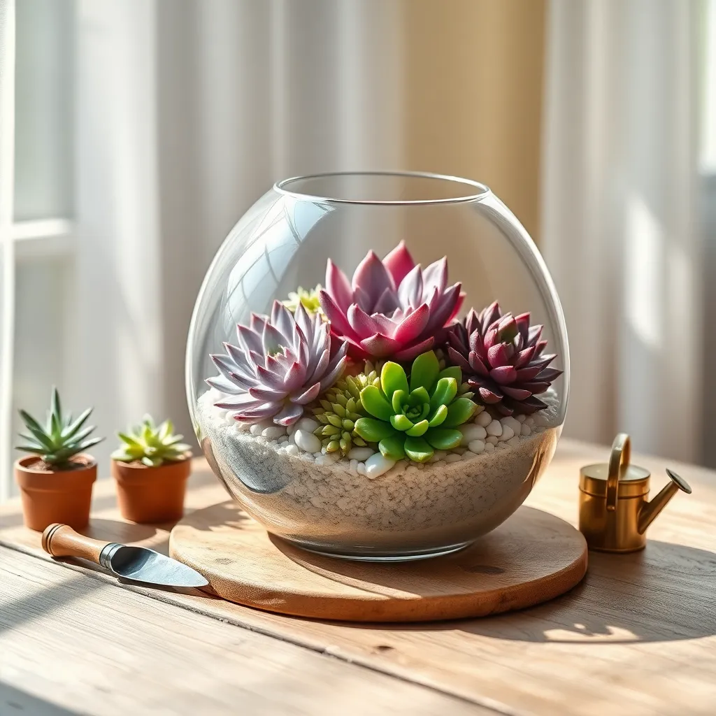 It gives off a serene, chic, and perfectly contained mood, perfect for brightening a desk or a small bedside table in a cozy, bright room. The presence of the miniature brass watering can and the wooden base adds a touch of warm, intentional styling. Keep this arrangement simple: use only a few main plants and choose a clean white medium (sand or pebbles) for a crisp, stylish foundation.