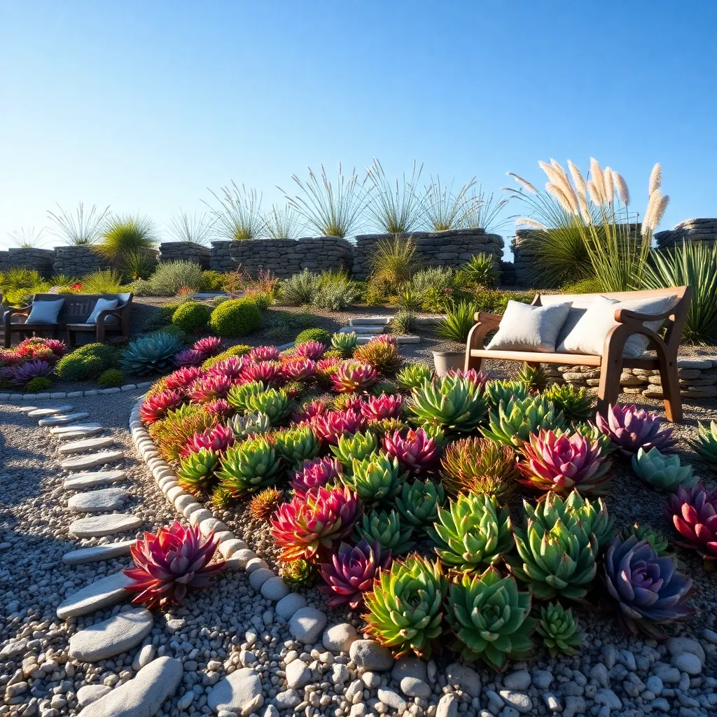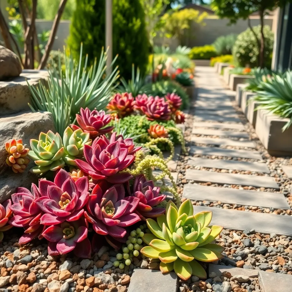 It generates an immediate feeling of warmth and discovery, guiding the eye down the path toward the lush landscape beyond. The vibrant colors of the Echeverias next to the pale pebbles are a striking contrast that feels rich and welcoming. A great tip for this style: use low-growing, spreading varieties of Sedum or Sempervivum around the path edges to fill in gaps and make the landscaping feel established and natural.