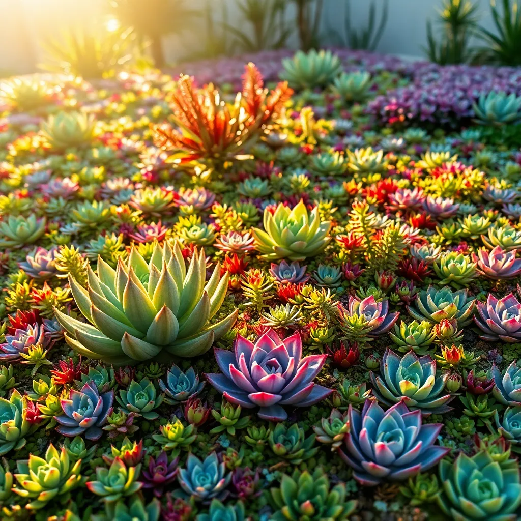 This stunning shot shows a dense, in-ground planting where the colors of the succulents are the absolute star of the show. The garden bed is packed with various species, including large rosettes in vibrant greens, deep purples, and hot pinks, all soaking up that gorgeous golden-hour sun. The design works because of the sheer density and the incredible color contrast, making the garden look like a luxurious carpet of living gems.