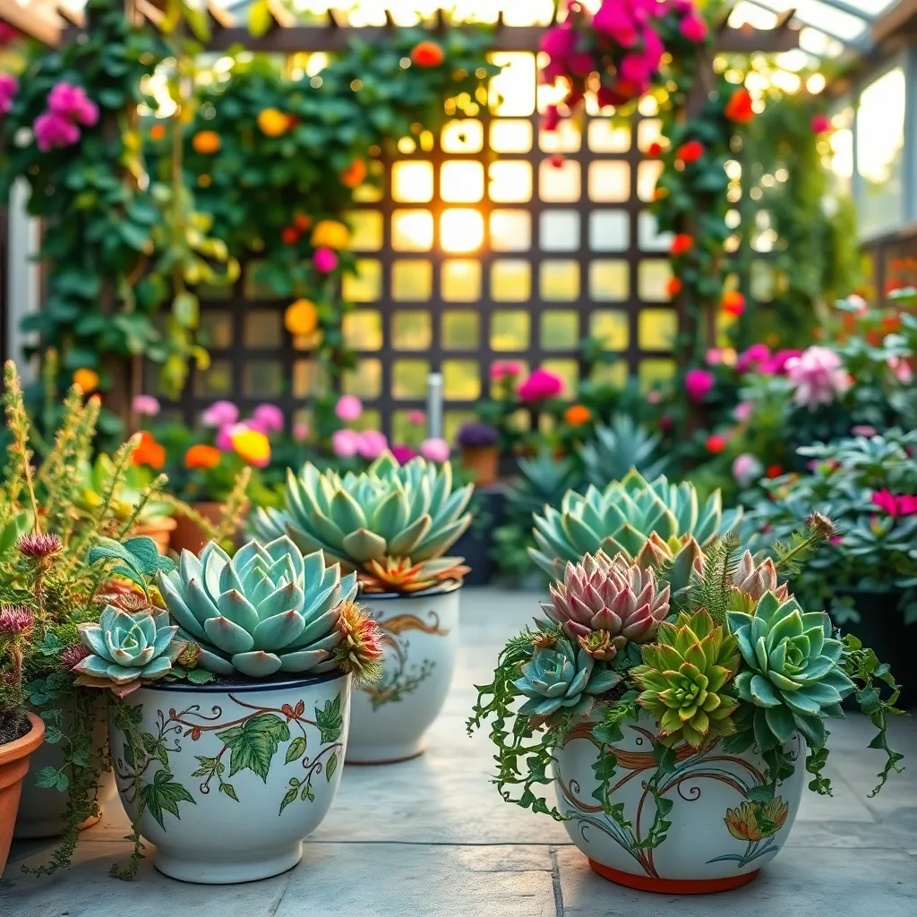 This image captures a cozy, enclosed garden space, possibly a sunroom or covered patio, featuring succulents planted in beautifully decorated white ceramic bowls. The pots are nestled on a patio surface with a backdrop of a dark wooden trellis covered in brightly colored flowering vines, creating a lush, fairy-garden feel. The visual appeal comes from the juxtaposition of the smooth, cool-toned succulent rosettes against the intricate patterns of the containers, softened by the trailing greenery.