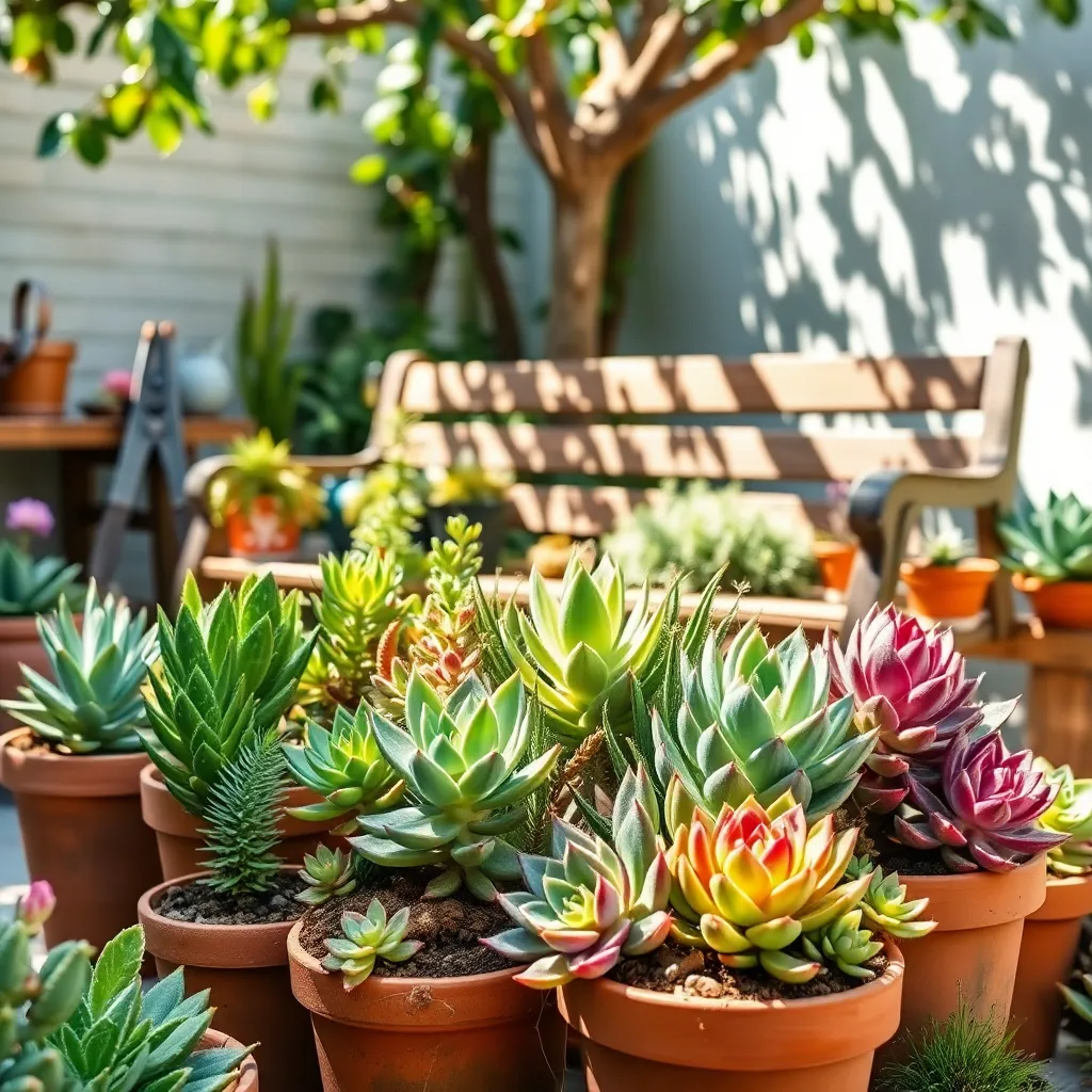 This is an intimate patio setting featuring a collection of succulents grouped in classic terracotta pots, set against the backdrop of a wooden garden bench and the dappled shade of a mature tree. The cluster of potted plants includes a great variety of leaf shapes and bright colors, from lime green to rich burgundy, creating a focal point right in the foreground. The design is effective because it uses simple, uniform pots to contain a massive variety of plants, providing visual structure while the bench suggests relaxation and comfort.
