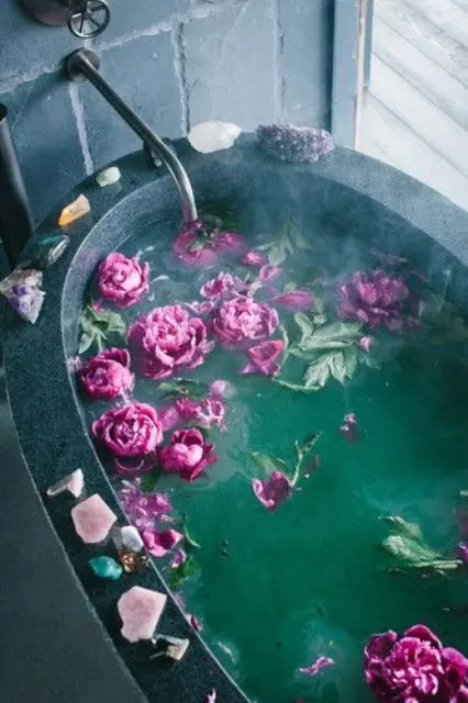 The rich, jewel-toned water paired with the lush pink roses creates a dramatic yet incredibly serene and grounding experience. It’s a truly opulent and calming scene, inviting you to sink in and let the worries of the day melt away.