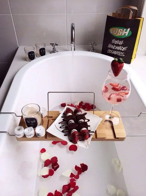 A clean, white bathtub is ready for a luxurious soak, adorned with scattered red and white rose petals. A sleek wooden bath caddy holds a plate of chocolate-dipped strawberry skewers, a glass of pink drink garnished with a strawberry, and a couple of small candles, alongside a Lush bag hinting at more pampering.