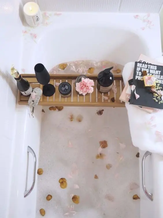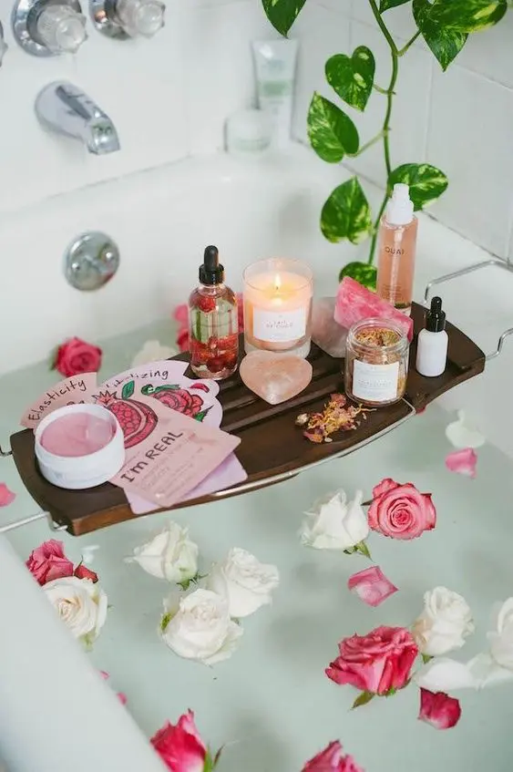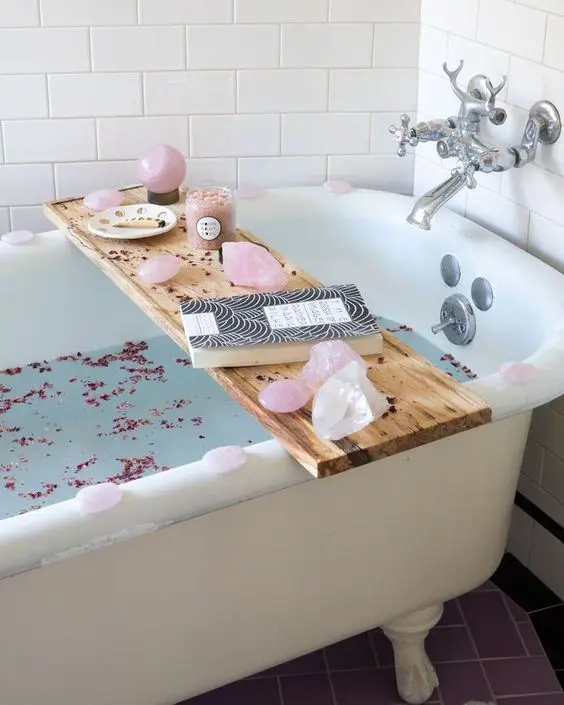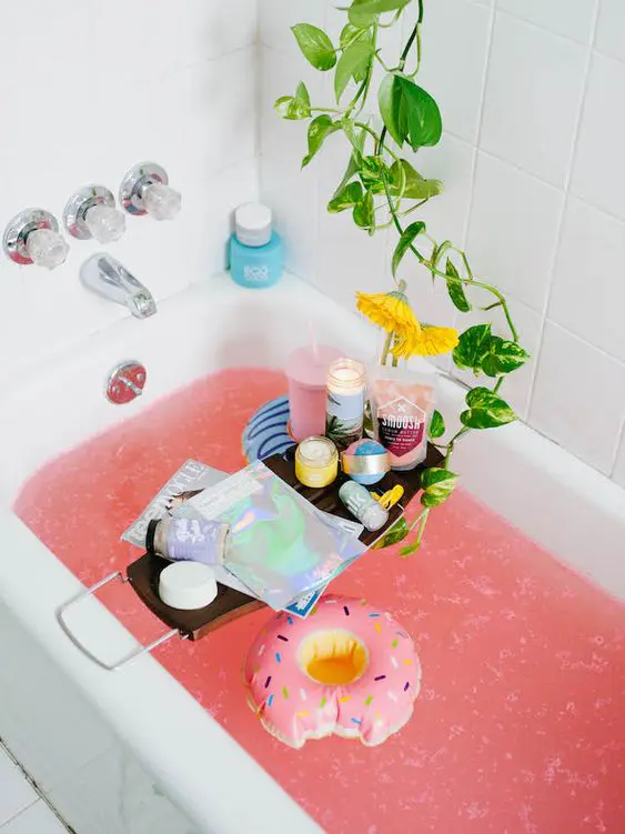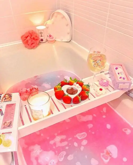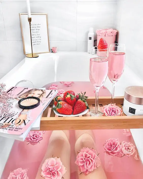 The bright pink water immediately signals fun and a celebratory mood, while the bath caddy offers practical elegance, keeping everything you need for a luxurious soak within easy reach. This setup creates a whimsical, indulgent, and super Instagrammable vibe, perfect for a joyful self-care moment.