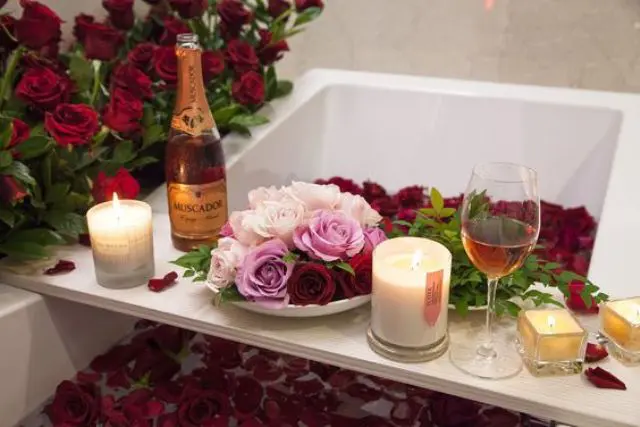 The soft bubbles and scattered petals evoke a feeling of ultimate pampering and gentle indulgence, making the space feel incredibly warm and welcoming. It’s the perfect setup for a relaxing evening, making you feel completely cherished.