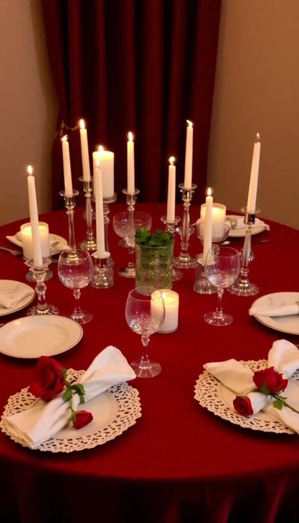 Deep red linens serve as the backdrop for a forest of silver candelabras and flickering white taper candles. White doily-style placemats add a vintage touch while single red roses are tucked into the napkin rings.