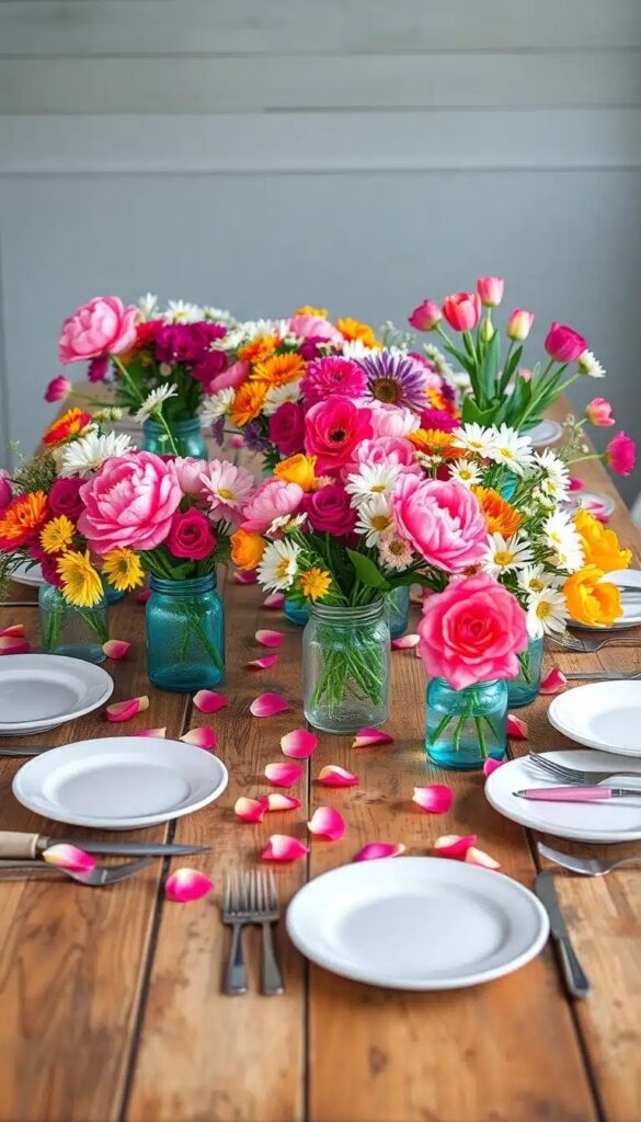 A beautiful wooden farmhouse table is scattered with loose pink petals and several turquoise mason jars overflowing with roses and daisies. The white plates are simple and clean which allows the explosion of pink, orange, and white blooms to take center stage.
