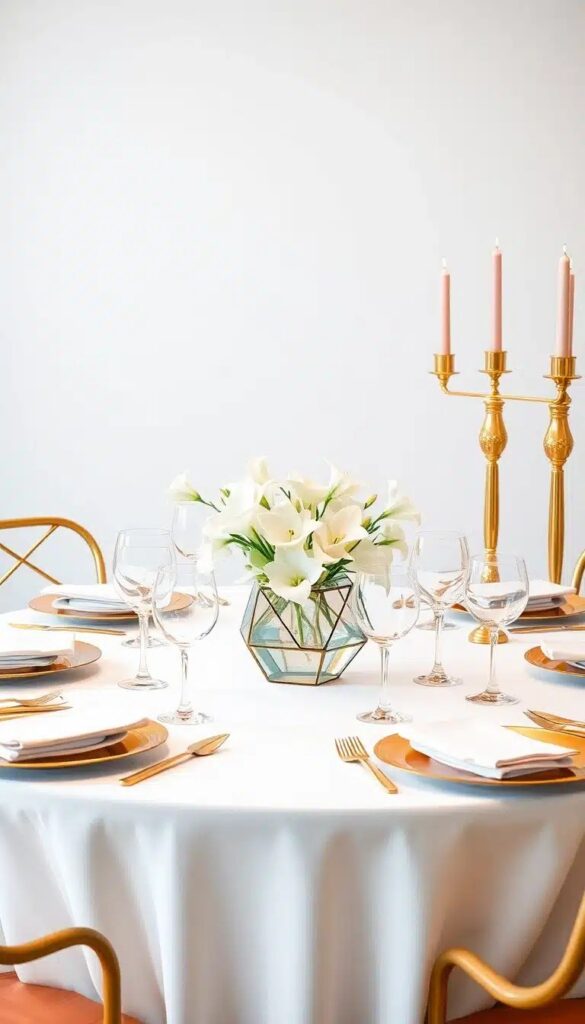 A round table is set with shimmering gold chargers and a tall, ornate gold candelabra holding soft pink tapers. A geometric glass vase in the center is filled with crisp white lilies that look incredibly fresh against the white linen.