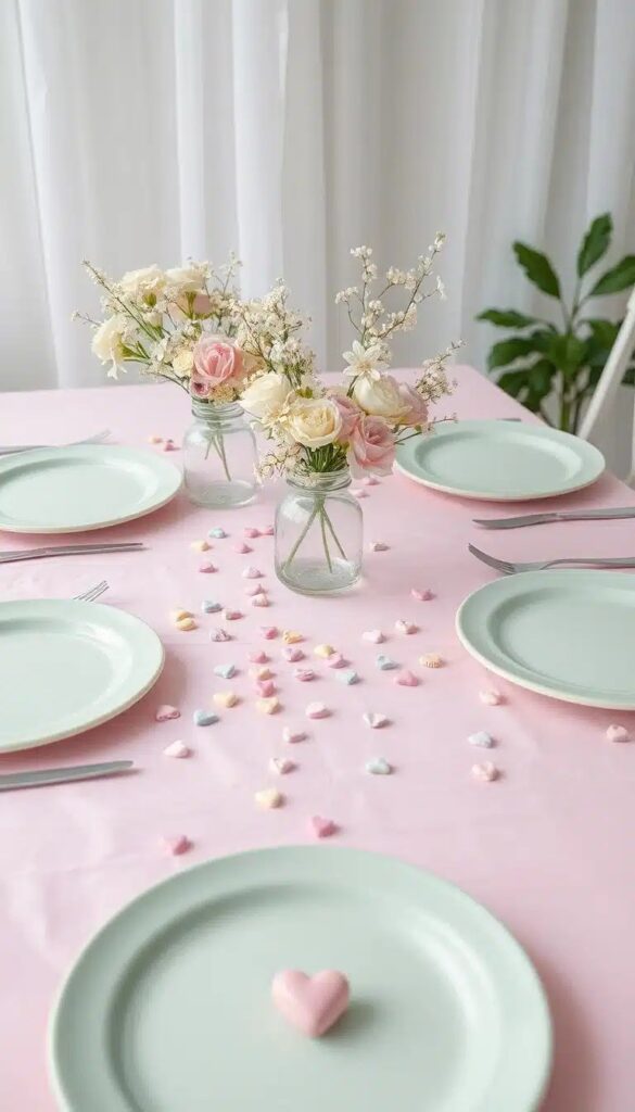 Soft mint green plates sit atop a delicate pink tablecloth that is scattered with tiny pastel heart-shaped candies. Small clear jars hold clusters of light pink and white roses which adds a soft floral touch to the whimsical scene.