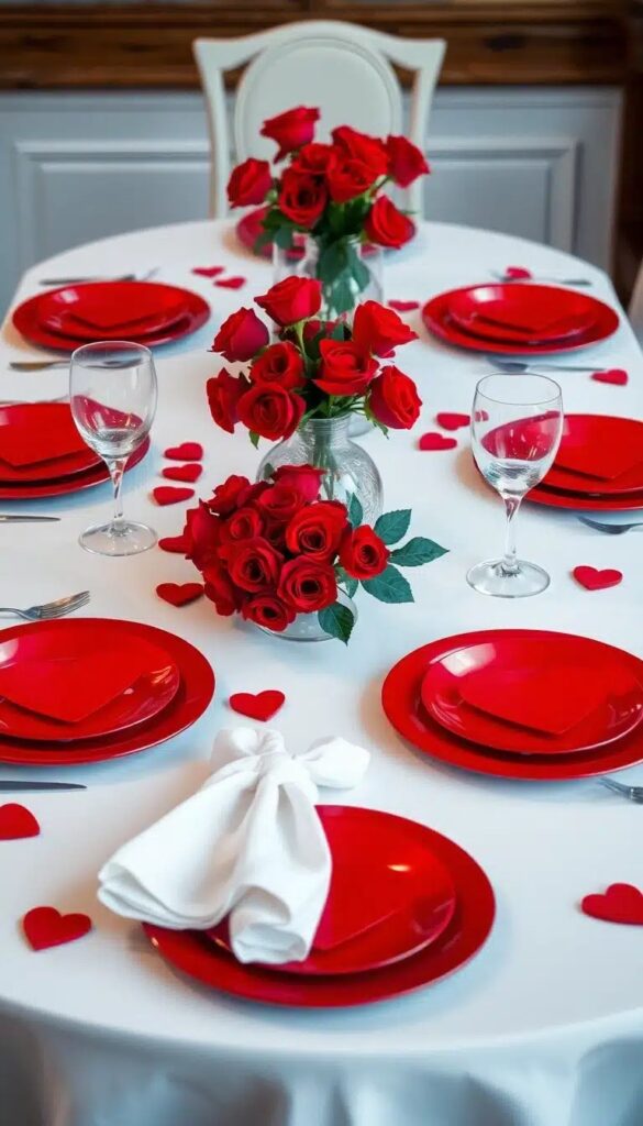 Bright red plates are stacked on a white tablecloth and accented by small felt hearts and lush bouquets of red roses. The white napkins are tied in a simple knot to balance out the intensity of the vibrant red ceramics.