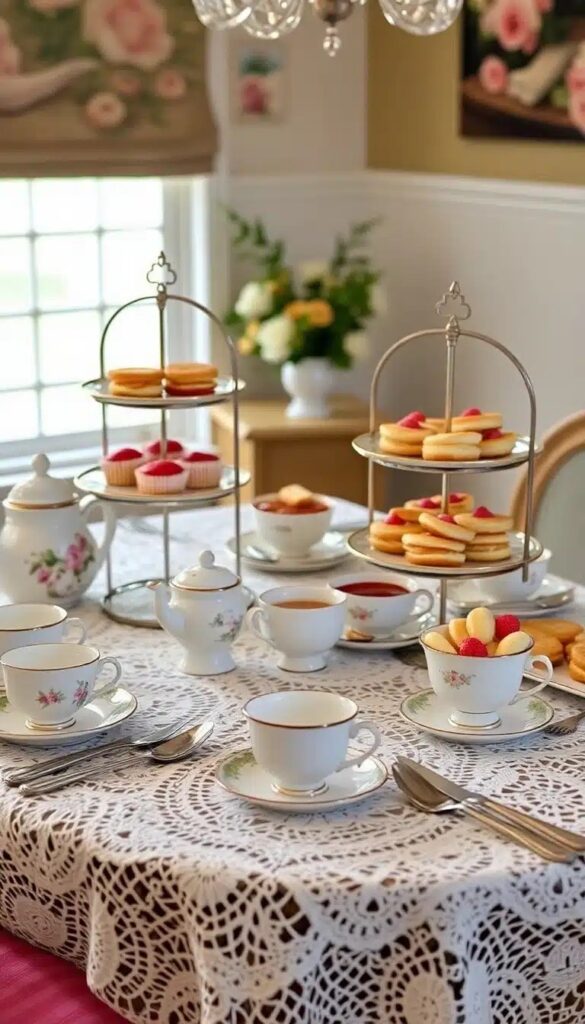 A lace tablecloth is covered in delicate floral china, silver tiered dessert stands, and steaming teapots. Little raspberry-topped treats and cupcakes are arranged perfectly to invite guests to sit down for an afternoon chat.