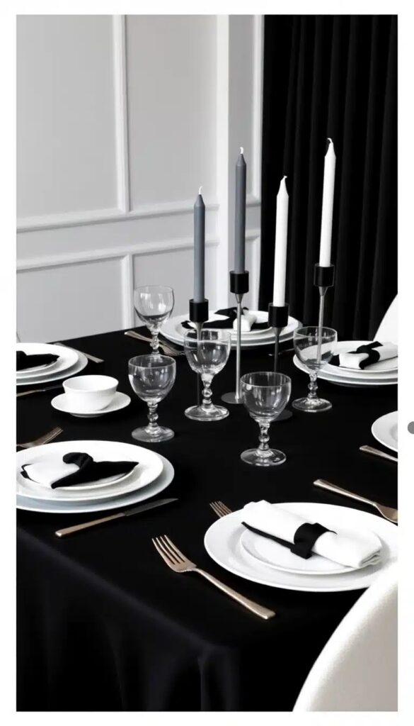 To get this look, focus on a strict two-tone palette and use black napkins with a simple white ribbon tie.