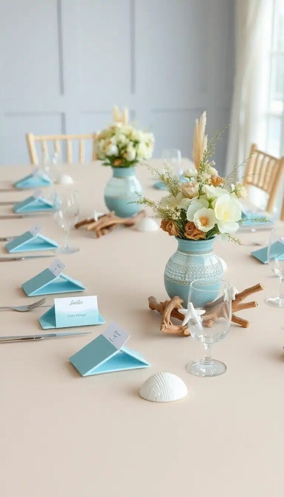 Light blue glass vases hold delicate white and dried flowers while pieces of driftwood and starfish are scattered across a sandy beige tablecloth. The place cards are tucked into tiny blue tented stands that match the soft seaside theme perfectly.