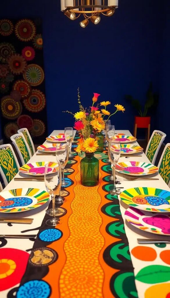 This setup features a long white table adorned with a striking orange and green patterned runner that feels incredibly energetic. Bright yellow and pink daisies sit in simple green glass bottles while the plates boast a matching kaleidoscopic design.