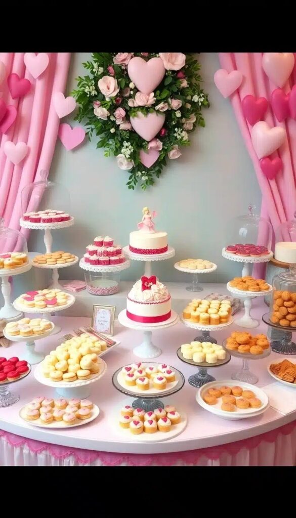 A massive spread of pink cupcakes, macarons, and cakes is arranged on white pedestals against a backdrop of pink drapes and a heart-shaped floral wreath. The symmetry of the dessert stands makes the table feel organized despite the huge variety of treats.