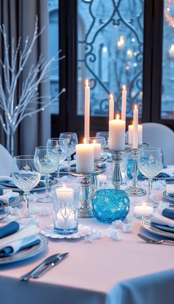 Icy blue glass bowls and snowflake-patterned napkins are paired with tall white candles and silver accents. Tiny white decorative “snow” is scattered across the table to lean into a chilly but beautiful winter theme.