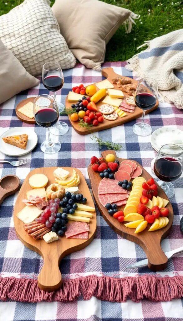 A plaid blanket is spread out on the grass with wooden boards piled high with cheeses, fruits, and meats alongside glasses of red wine. Soft beige pillows are tossed nearby to encourage lounging and relaxed grazing.