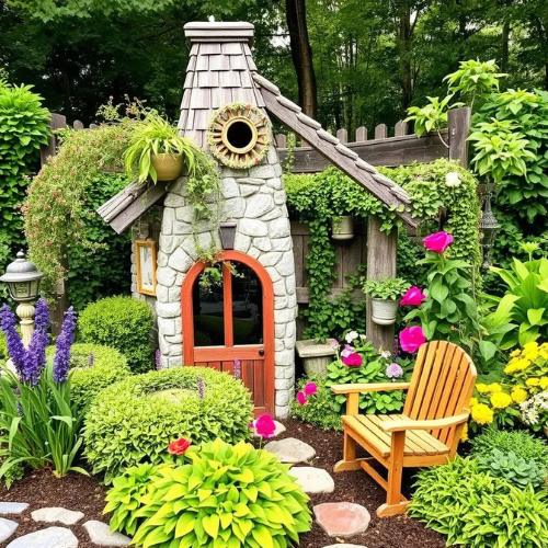 Dominated by a fabulous, almost hobbit-like stone structure with a small wooden door, this corner is pure escapism. Lush, bright green hostas and neatly trimmed shrubs surround the stone cottage, making it appear nestled perfectly into the foliage. A wooden rocking chair sits invitingly to the side, completing the cozy scene.