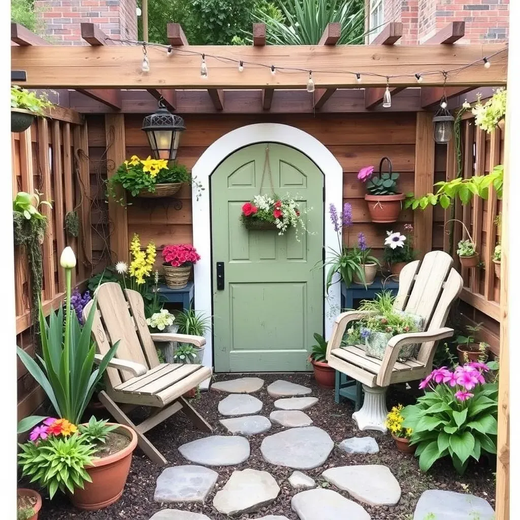 This intimate seating area is tucked beneath a warm wooden pergola, creating a sense of shelter and focus around a lovely arched, light green door. Two wooden Adirondack-style chairs with folding features face each other, inviting conversation. The space is softened by hanging baskets and pots placed around the stone path.