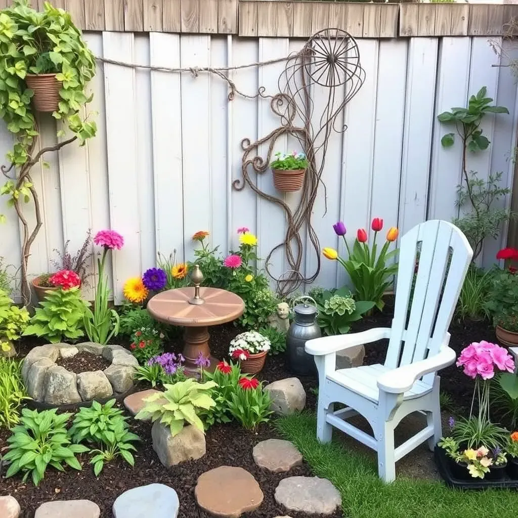 A light-colored, vertical-plank fence serves as a calming backdrop for a relaxed and textural corner garden. A pale blue Adirondack chair provides a comfortable anchor, surrounded by a charming mix of tulips, daisies, and low-lying ground cover. A vine with a rustic metal accent piece climbs the fence, adding vertical drama.