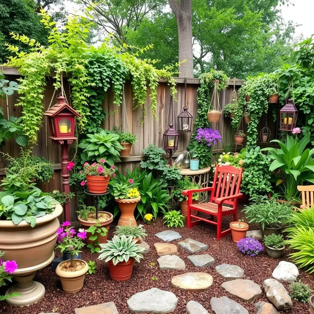 This beautifully enclosed space focuses on creating a cozy, secret room feeling using a high fence draped in thick ivy and other climbing plants. The deep red Adirondack chair is a striking focal point, surrounded by hanging wooden lanterns that add warmth and atmosphere. A variety of potted succulents and flowering plants fill the ground level.